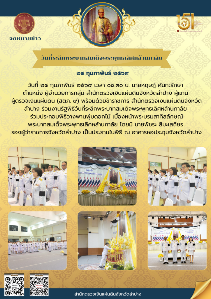 วันที่ ๒๔ กุมภาพันธ์ ๒๕๖๙ เวลา ๐๘.๓๐ น. นายหฤษฎ์ คันทะรักษา ตำแหน่ง ผู้อำนวยการกลุ่ม สำนักตรวจเงินแผ่นดินจังหวัดลำปาง ผู้แทน ผู้ตรวจเงินแผ่นดิน (สตภ. ๙) พร้อมด้วยข้าราชการ สำนักตรวจเงินแผ่นดินจังหวัดลำปาง ร่วมงานรัฐพิธีวันที่ระลึกพระบาทสมเด็จพระพุทธเลิศหล้านภาลัย ร่วมประกอบพิธีวางพานพุ่มดอกไม้ เบื้องหน้าพระบรมสาทิสลักษณ์พระบาทสมเด็จพระพุทธเลิศหล้านภาลัย โดยมี นายพัชระ สิมะเสถียร รองผู้ว่าราชการจังหวัดลำปาง เป็นประธานในพิธี ณ อาคารหอประชุมจังหวัดลำปาง