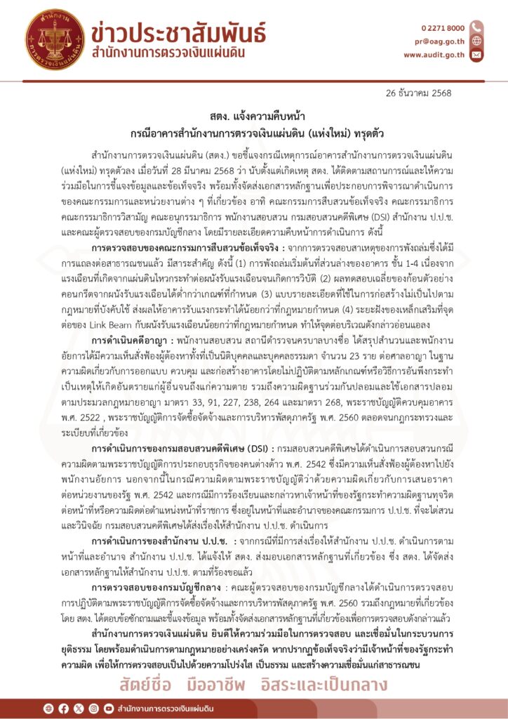 สำนักงานการตรวจเงินแผ่นดิน (สตง.) ขอชี้แจงกรณีเหตุการณ์อาคารสำนักงานการตรวจเงินแผ่นดิน (แห่งใหม่) ทรุดตัวลง เมื่อวันที่ ๒๘ มีนาคม ๒๕๖๘ ว่า นับตั้งแต่เกิดเหตุ สตง. ได้ติดตามสถานการณ์และให้ความร่วมมือในการชี้แจงข้อมูลและข้อเท็จจริง พร้อมทั้งจัดส่งเอกสารหลักฐานเพื่อประกอบการพิจารณาดำเนินการของคณะกรรมการและหน่วยงานต่าง ๆ ที่เกี่ยวข้อง อาทิ คณะกรรมการสืบสวนข้อเท็จจริง คณะกรรมาธิการ คณะกรรมาธิการวิสามัญ คณะอนุกรรมาธิการ พนักงานสอบสวน กรมสอบสวนคดีพิเศษ (DSI) สำนักงาน ป.ป.ช. และคณะผู้ตรวจสอบของกรมบัญชีกลาง