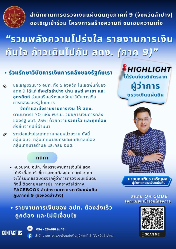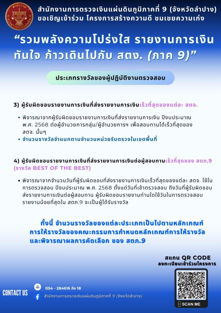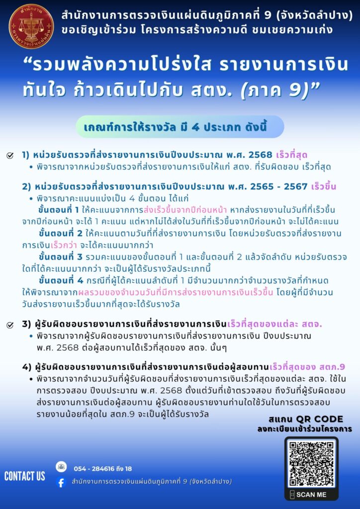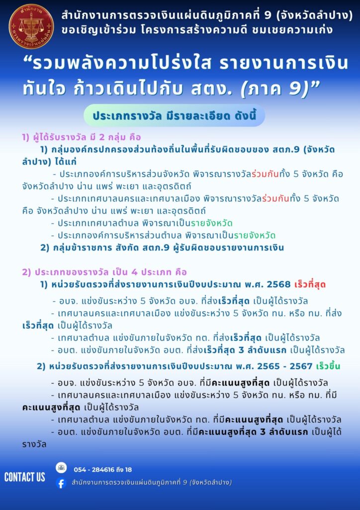 สตภ. 9 (จังหวัดลำปาง) ขอเชิญชวนชาว อปท. ทั้ง 5 จังหวัด ในเขตพื้นที่ ได้แก่ จังหวัดลำปาง จังหวัดน่าน จังหวัดแพร่ จังหวัดพะเยา และจังหวัดอุตรดิตถ์ เข้าร่วมโครงการสร้างความดี ชมเชยความเก่ง เพื่อเสริมสร้างและรักษาวินัยการเงินการคลังของรัฐโดยการจัดทำและส่งรายงานการเงิน ให้ สตง. ตามมาตรา 70 แห่ง พ.ร.บ. วินัยการเงินการคลังของรัฐ พ.ศ. 2561 ด้วยความรวดเร็ว และถูกต้องยิ่งขึ้นจากปืที่ผ่านมา ประเภทรางวัลแบ่งตามกลุ่มหน่วยงาน ประกอบด้วย กลุ่ม อบจ. กลุ่มเทศบาลนครและเทศบาลเมือง กลุ่มเทศบาลตำบล และกลุ่ม อบต.
